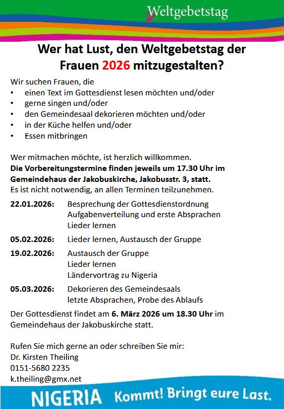 Herzliche Einladung zur Mitarbeit am Weltgebetstag am 06.03.26 um 18:30 Uhr im Gemeindehaus der Jakobuskirche